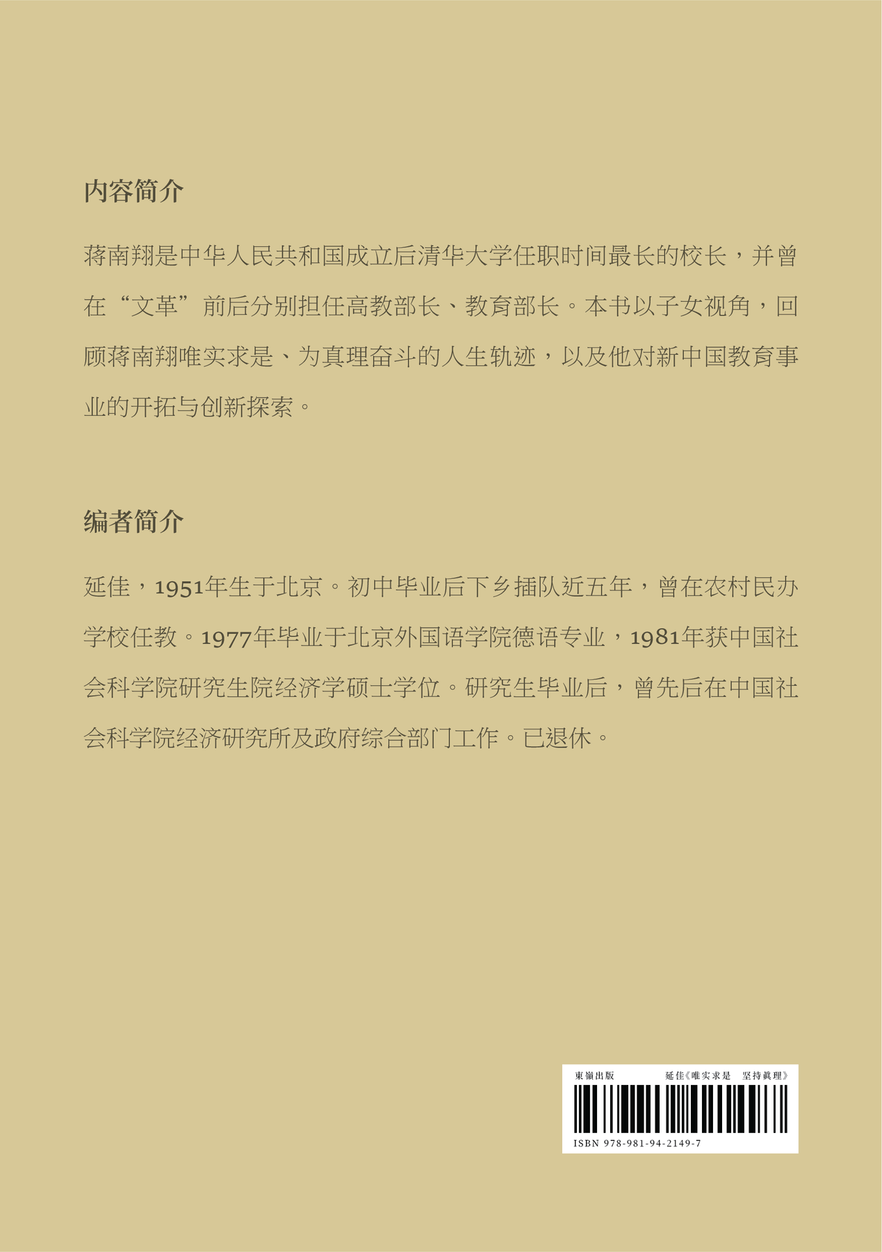 蔣南翔是中華人民共和國成立後清華大學任職時間最長的校長,並曾在「文革」前後分別擔任高等教育部長、教育部長。本書以子女視角,回顧蔣南翔唯實求是、為真理奮鬥的人生軌跡,以及他對新中國教育事業的開拓與創新探索。