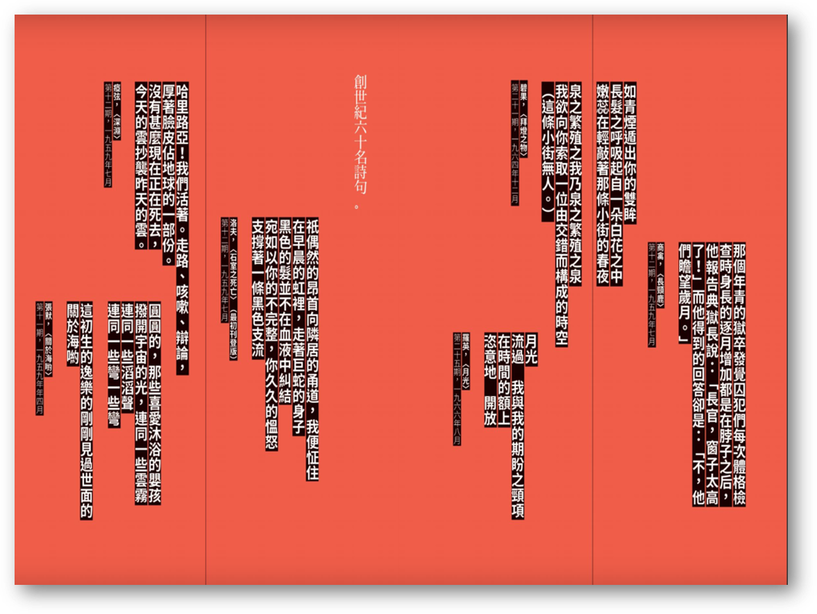 *時值《創世紀》詩刊六十週年,這是一本用視覺復刻的《創世紀》。以漫畫、活字、拼貼、插圖等各種視覺元素,向淬鍊六十年的詩人們致敬。