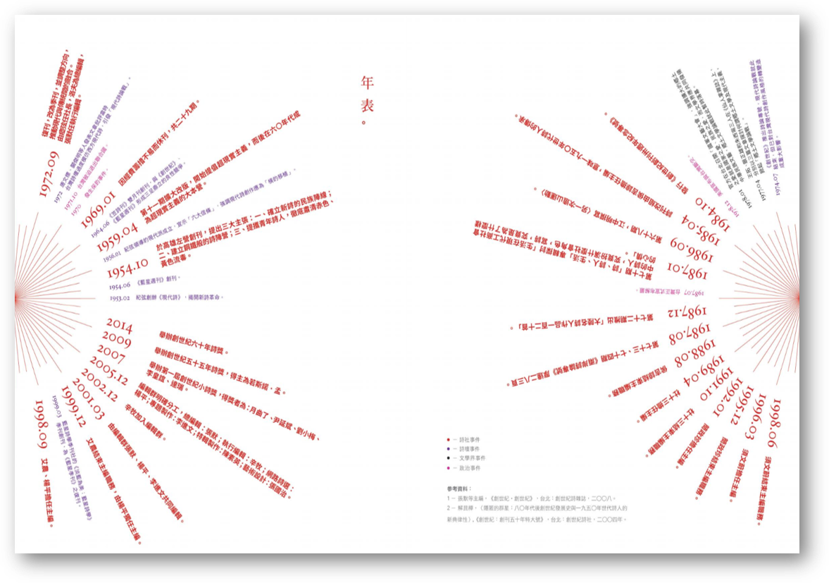 如今,這個詩的國度、語言的異世界已存在60年,無數的學者及詩人分別以論文與詩致敬,我們則耽溺於那超現實的意象世界。在這本書中,我們試著探尋,如何把創世紀以語言為核心的世界翻譯出來?如何替那些永不過時的語言找到適當的色票?如何在這本書中,以藝術家的畫筆傳達創世紀的前衛?以設計師的色彩呈現語言文字的顛覆造次?我們能不能做出一本書,讓現代的讀者感受到1954年翻開創世紀詩刊的興奮情緒?同樣開啟那個絢麗國度的入口?讓另一世界的光線滲出?